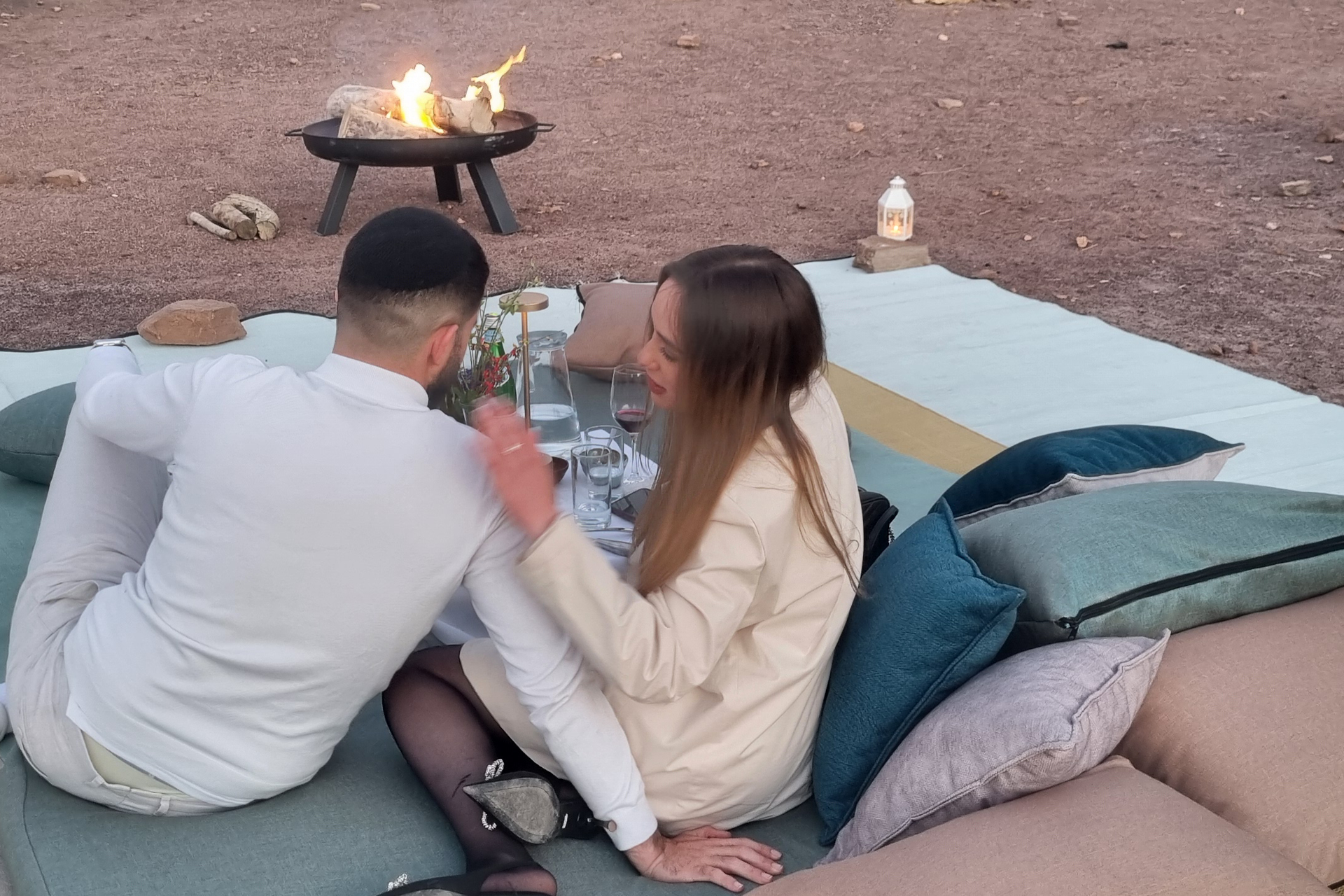 פינת ישיבה מדברית וייחודית עם מזרנים, כריות, שמיכות וגזיבו, לצד מדורה חיה.